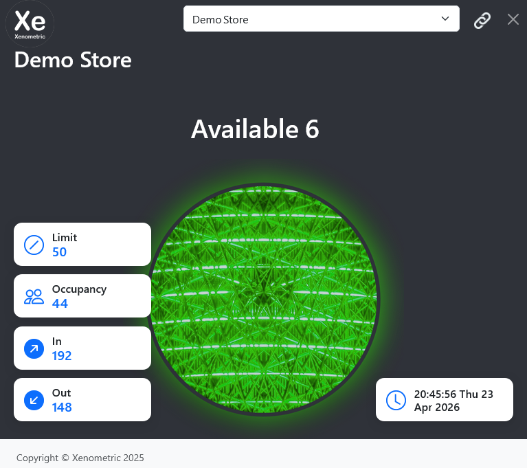 This dashboard shows a traffic light image that changes according to the current occupancy and the occupancy limit. When the occupancy exceeds the limit, the traffic light will turn red.